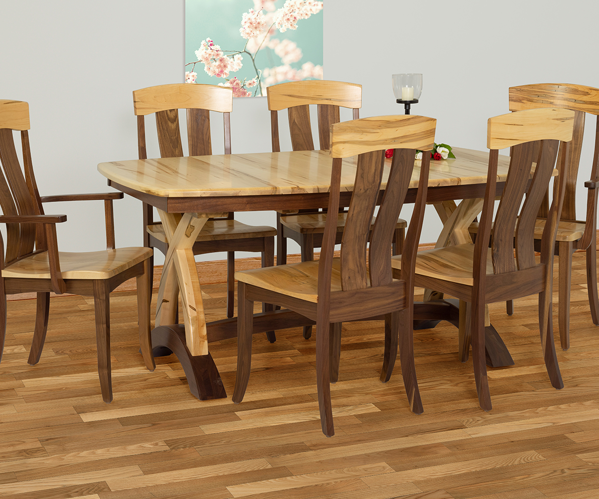 Table shown 42×66″ in wormy maple and walnut combo with clear finish.